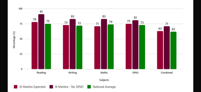 At St Martin's Primary, we believe that when children feel cared for, encouraged and inspired, they don’t just learn—they thrive. This year’s SATs results are a powerful reflection of that belief in action. They highlight the strength of a school community where high expectations are met with warmth and support, where every child is empowered to succeed, and where a love of learning pulses through everything we do.