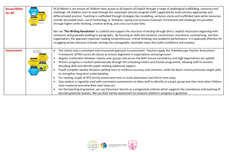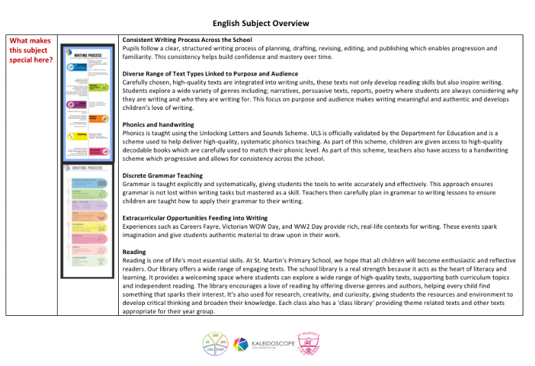 Our aim is to ensure that every child becomes a reader, a writer and a confident speaker by the time they leave St Martin’s. We aim to broaden pupils’ exposure to high-level vocabulary, allowing them to apply their understanding of language and grammatical features across the English curriculum.